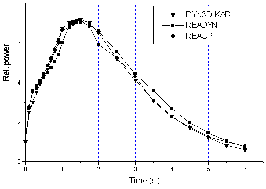 In Benchmark A the transient processes were caused by ejection of an asymmetric control rod in a VVER-core with zero power for 0.08 second. Feed back effects were neglected. One second later the shut down rods are inserted in core to suppress slow power increase. The purpose of Benchmark A is to determine the calculation precision of the transient process taking into account delayed neutrons. Our numerical results were compared with the results calculated by DYN3D code [8] and READYN code [9]. In calculations 24 points for axial direction Z and six points per each hexagon are used. In Fig. 1 there is shown the behaviour of average relative power during 6 second.